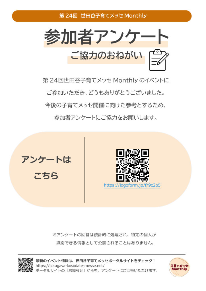 参加者アンケートご協力のお願い(~12/26) 投稿日: 2025年11月27日2025年11月27日 投稿者: 世田谷子育てメッセ 第24回世田谷子育てメッセMonthly のイベントにご参加いただき、どうもありがとうございました。 今後の子育てメッセ開催に向けた参考とするため、参加者アンケートにご協力をお願いします。(一つでも子育てメッセの登録イベントに参加された方が回答対象となります、1イベントにつき1回答となります) 【回答期限:令和7年12月26日(金)】 ↓↓↓アンケートはこちら↓↓↓ https://logoform.jp/f/9c2o5 ※アンケートの回答は統計的に処理され、特定の個人が識別できる情報として公表されることはありません。